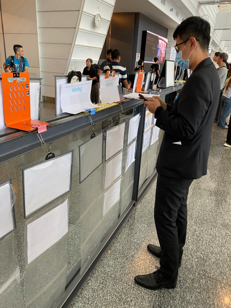 在桃園機場大廳,會有 KKday 的人員在入境大廳這樣,